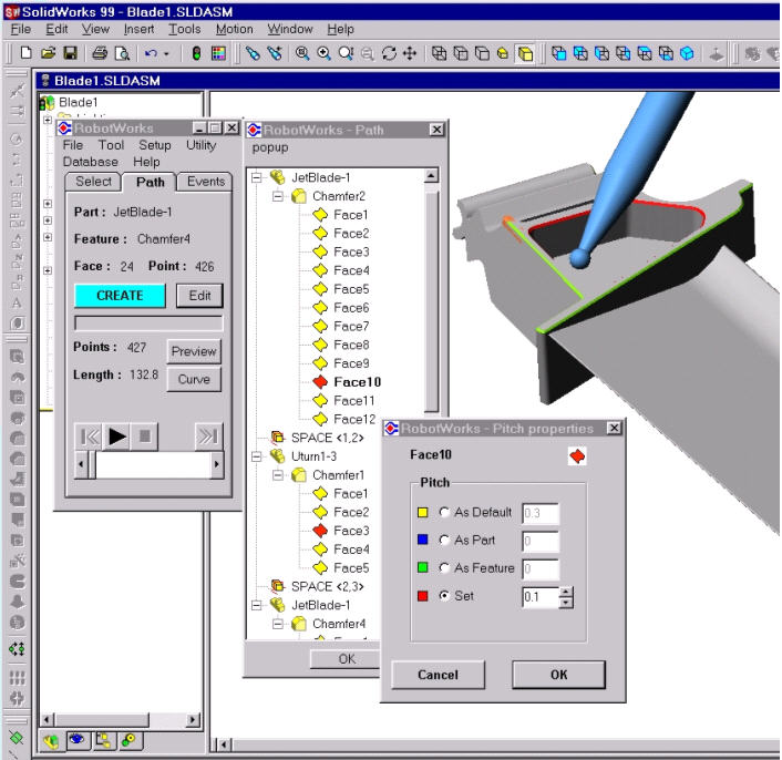 We clicked once on each chamfer, and RobotWorks calculated 427